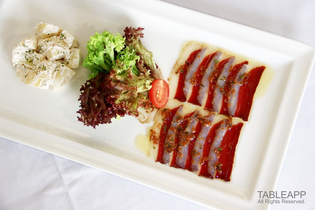 Sliced Cured Duck Jamon served with Argentinian potato salad and chimichurri infused olive oil