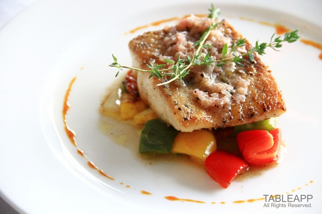 Barramundi Fish Fillet, lightly coated and pan fried with a lemon butter herb sauce and spring vegetables (RM35)