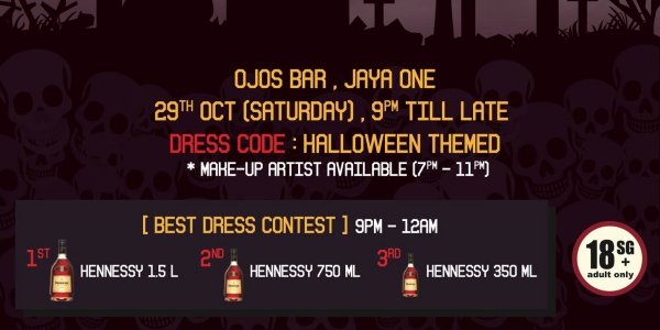 Dress up and stand a chance to win prizes at Ojos Bar’s Halloween Costume Party on this October 29, Saturday, 9pm onwards. Prizes include Hennessy, the world’s finest cognacs since 1765 and Ojos Halloween Signature Cocktail. If you need a helping hand for your make-up, make-up artists will be available from 7pm to 11pm. What are you waiting for?